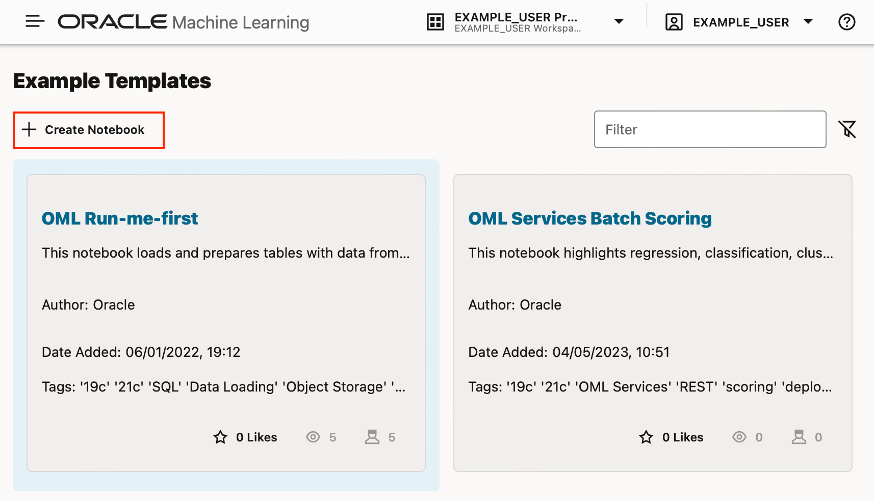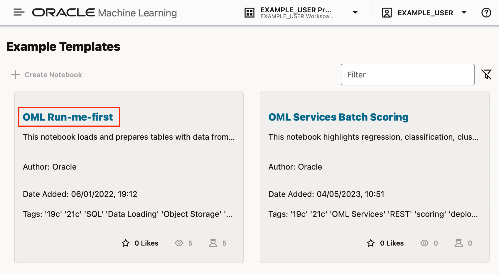 OML users can create their own templates, either as personal or shared templates. Shared templates can be used by any other OML user, whereas personal templates can only be seen by your user. If you want to share a notebook with a different user without making it into a shared template, you can export the notebook and another OML user can import the notebook in their own workspace/project. You can also give another OML user access to one of your workspaces.