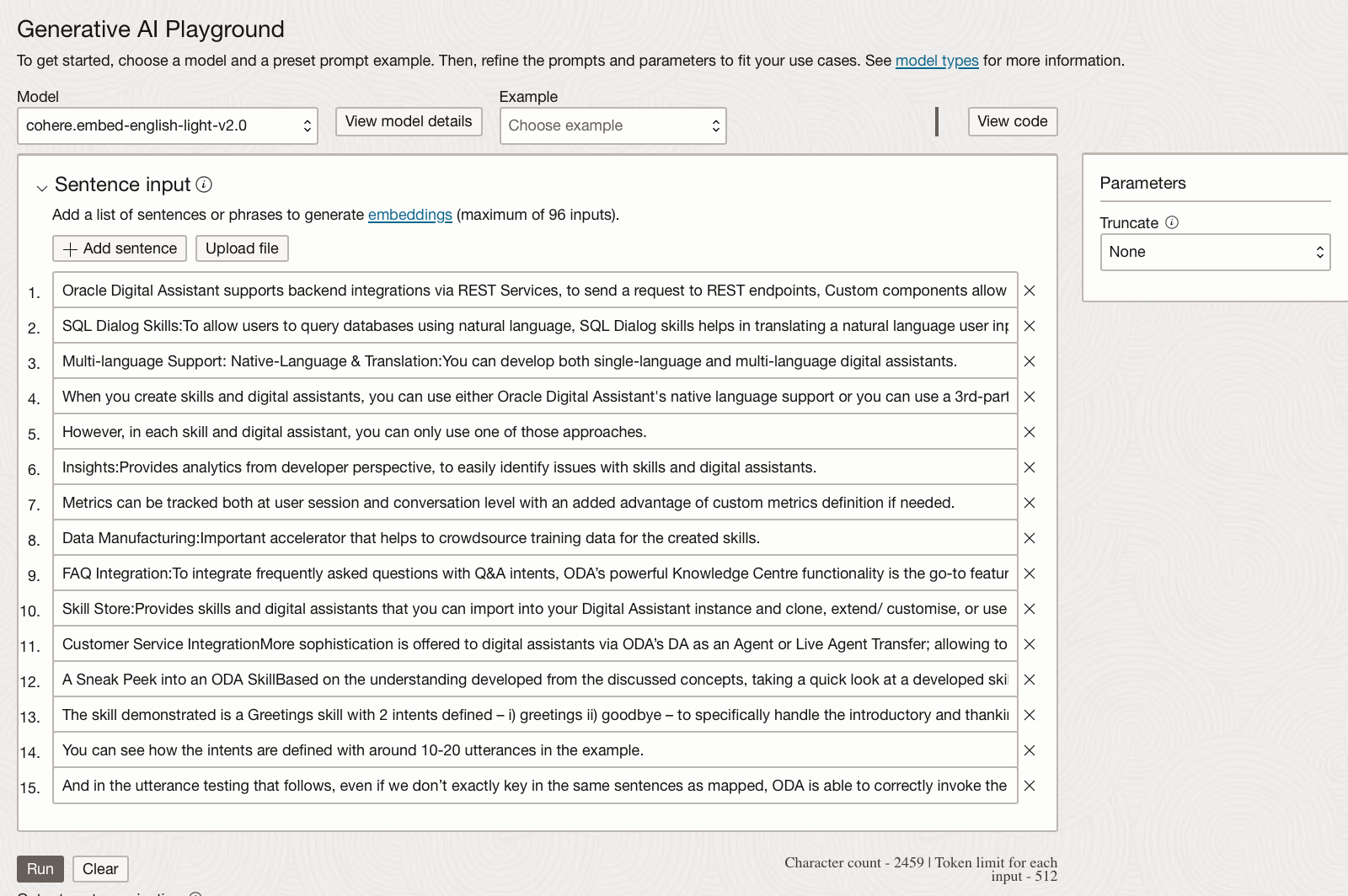 The text embedding models will let you decide whether to truncate the input, currently, you can add 96 sentences or a 96 line file.