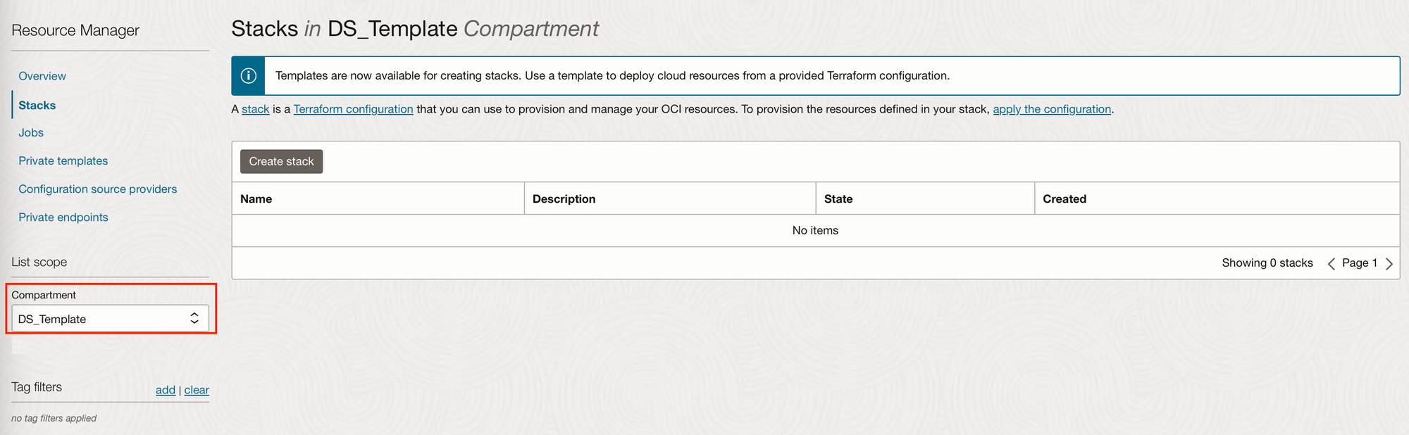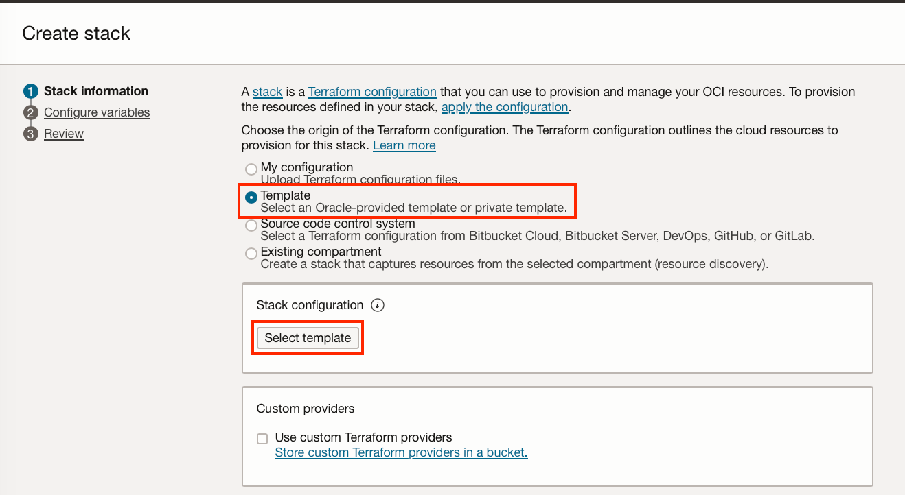 Click "Create stack", and select “Template”. You can now choose from a range of Oracle-created templates.