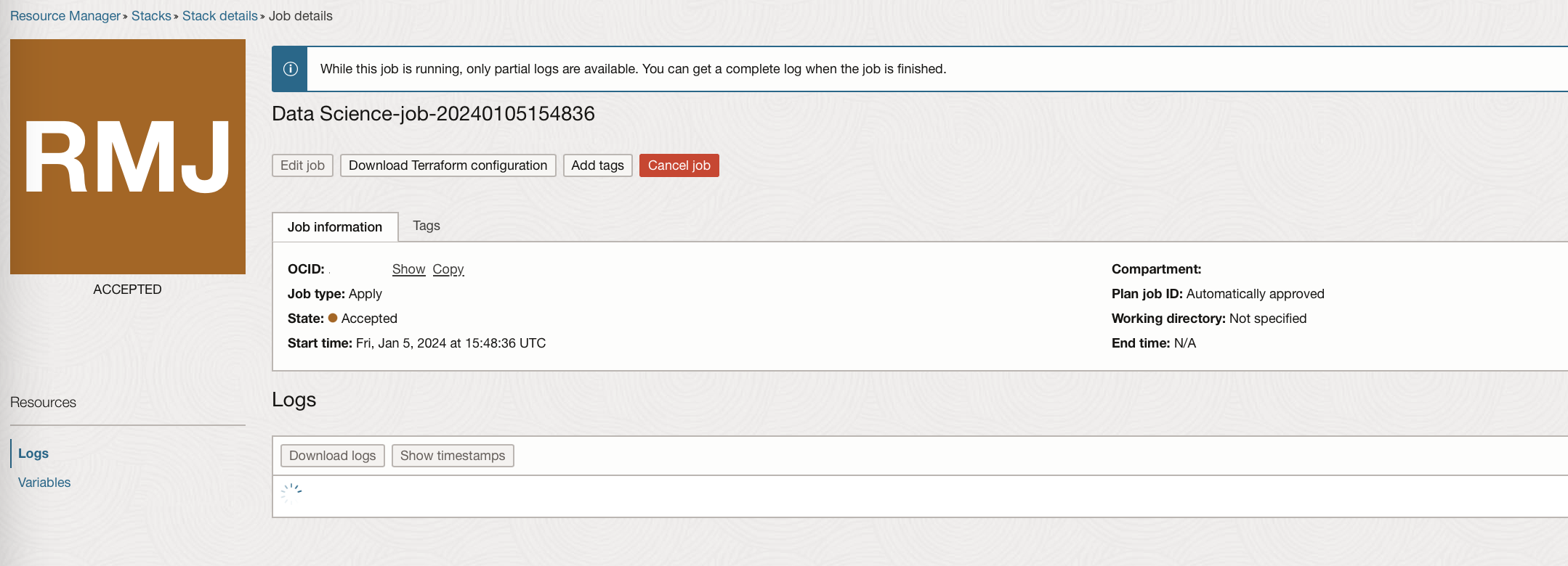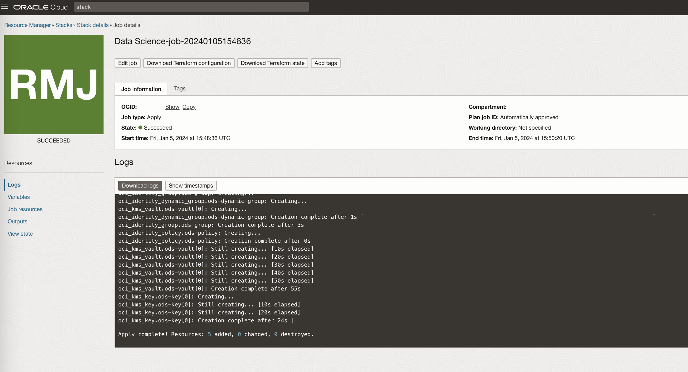 On clicking “Create” a job is started to create your stack.