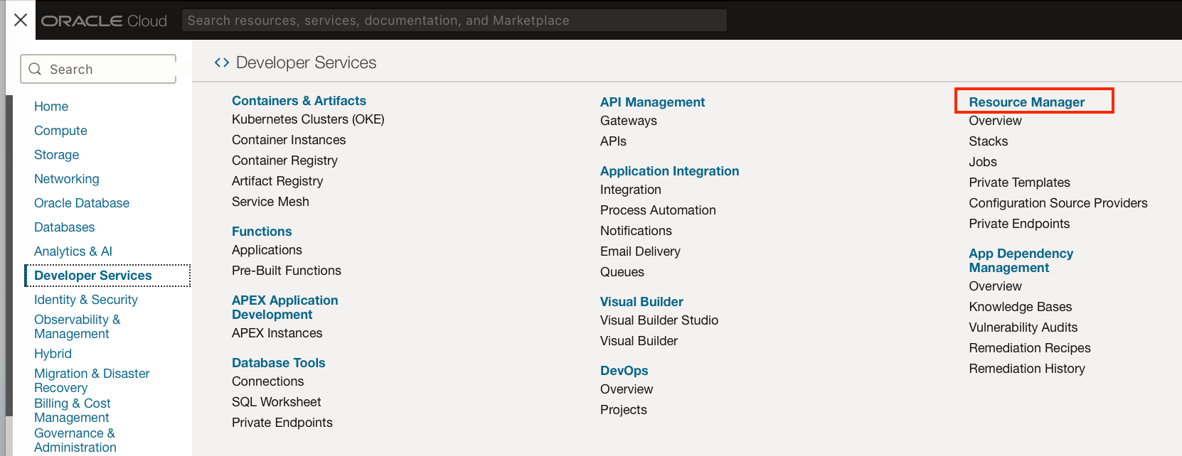 To use the template, from within the OCI console navigate to Developer Services → Resource Manager.
