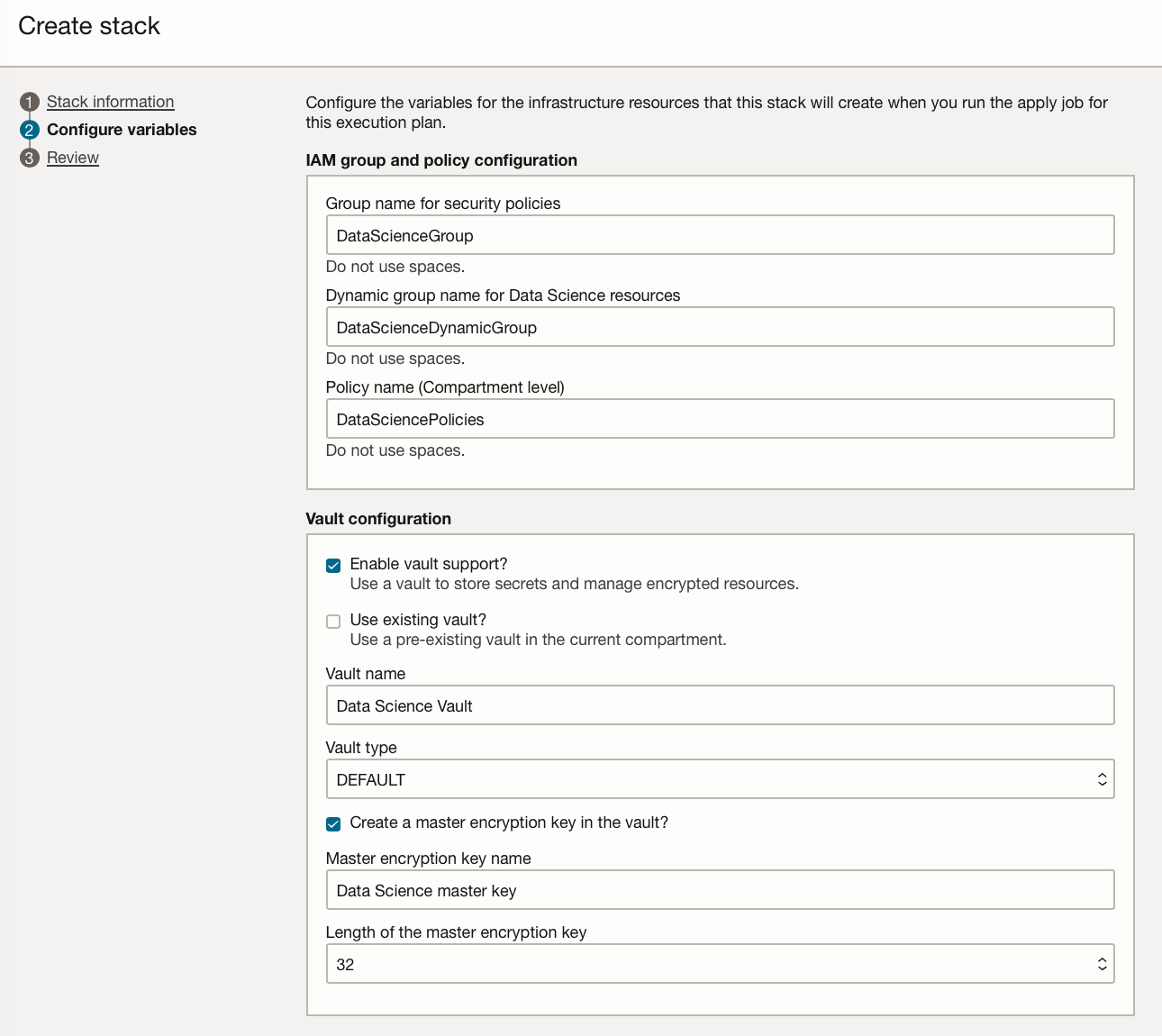 You are given the option to customise the names of the user group and dynamic group, and you can optionally create a vault and master key at the same time to store secrets such as passwords.