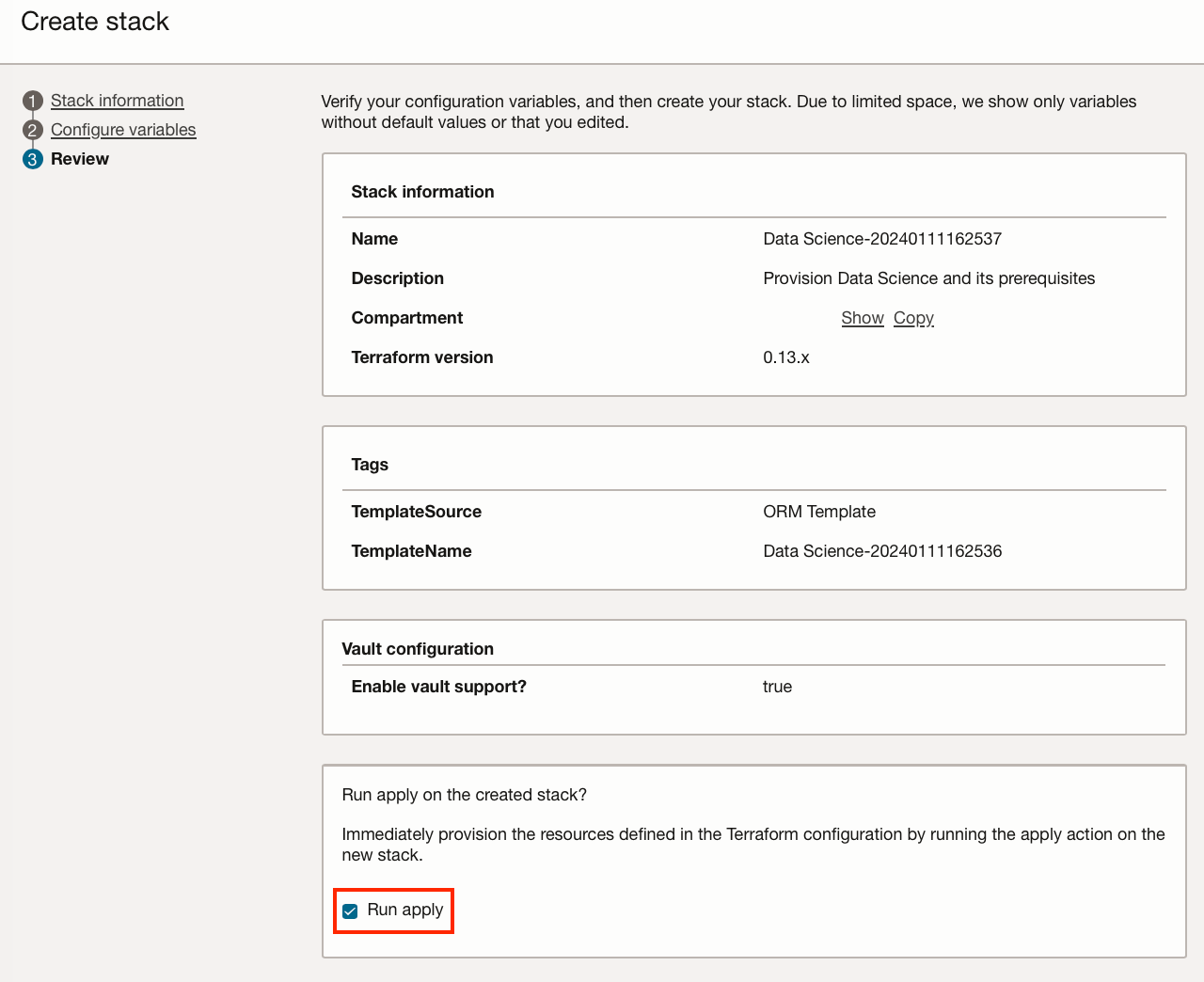 Check the “Run apply” checkbox, so when you click “Create”, the resources required will be provisioned immediately.