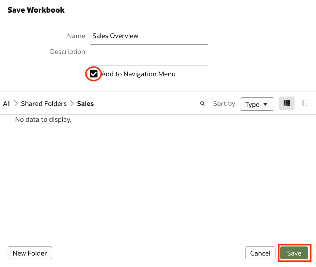 To include a workbook within this menu, ensure to select the Add to Navigation Menu option when saving the workbook within a first-level folder under the Shared location in the catalog (Figure 2).