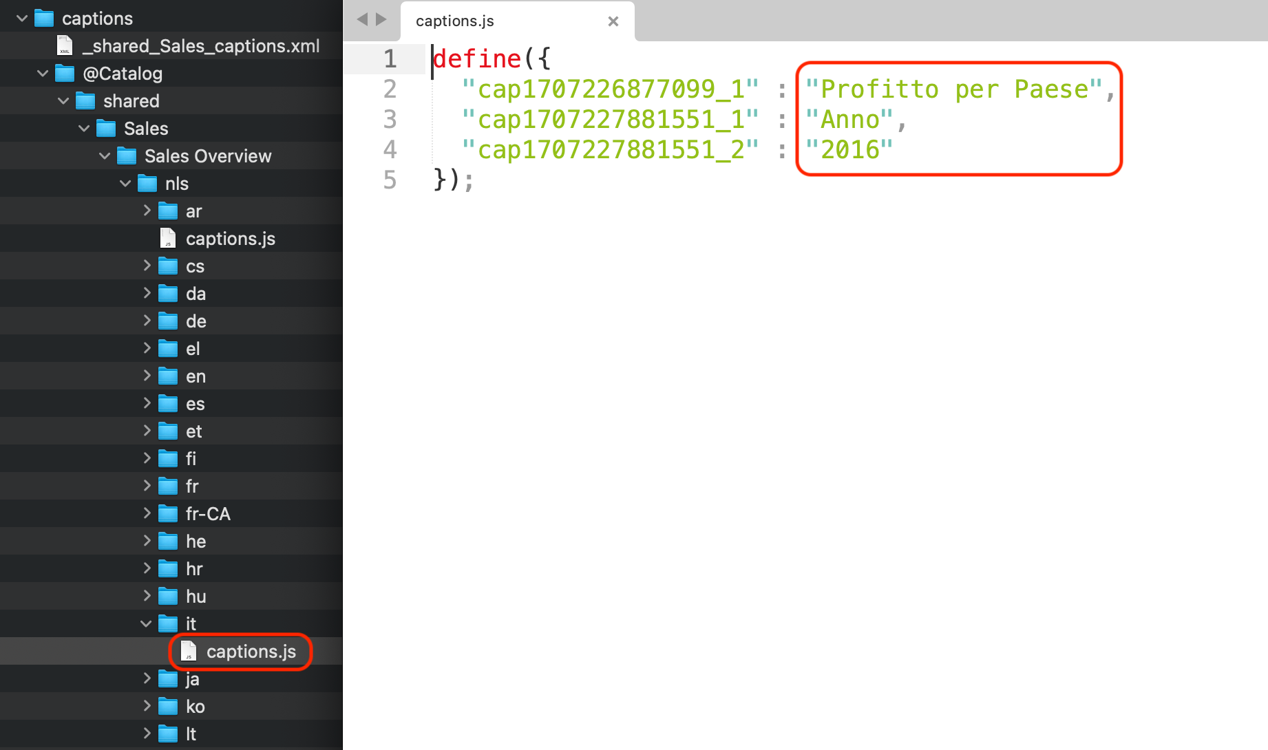 In the exported workbook captions ZIP file, you will find language-specific JS files for each supported locale. To translate captions, begin by opening the language-specific JS file you are interested in for editing. Then enter translated names into the appropriate caption elements (Figure 4), and add the modified file back into the exported ZIP file.