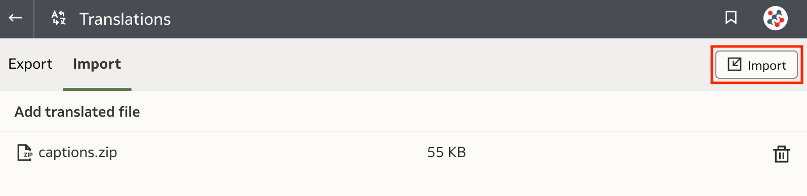 To import localized workbook captions, select the Import tab within the Translations page. Then click Select a file or drop it here to locate the file, and click on the Import button to proceed (Figure 5).
