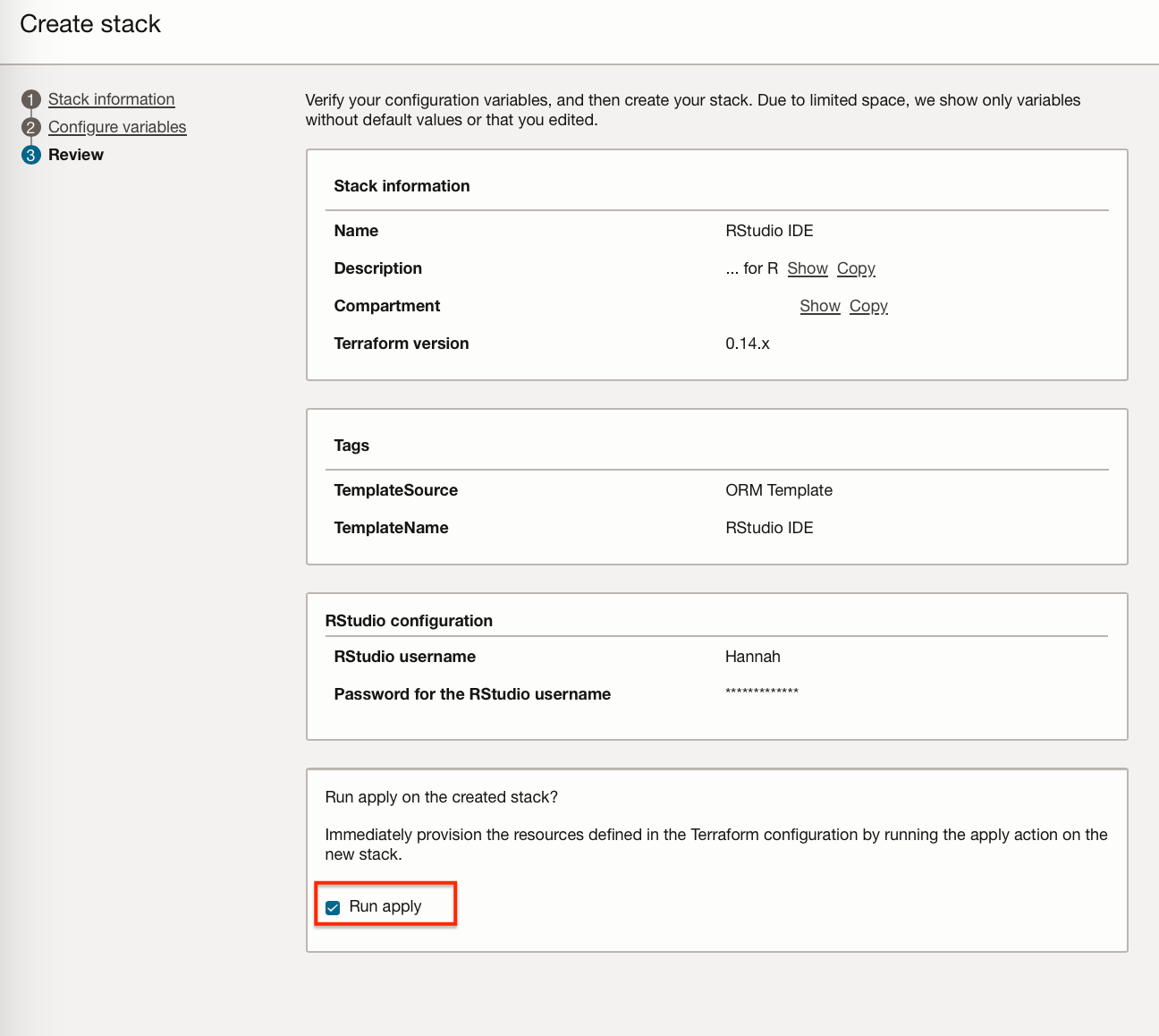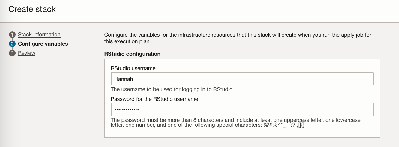 Make sure the compartment is correct and then click “Next” where you can specify the RStudio username and password.