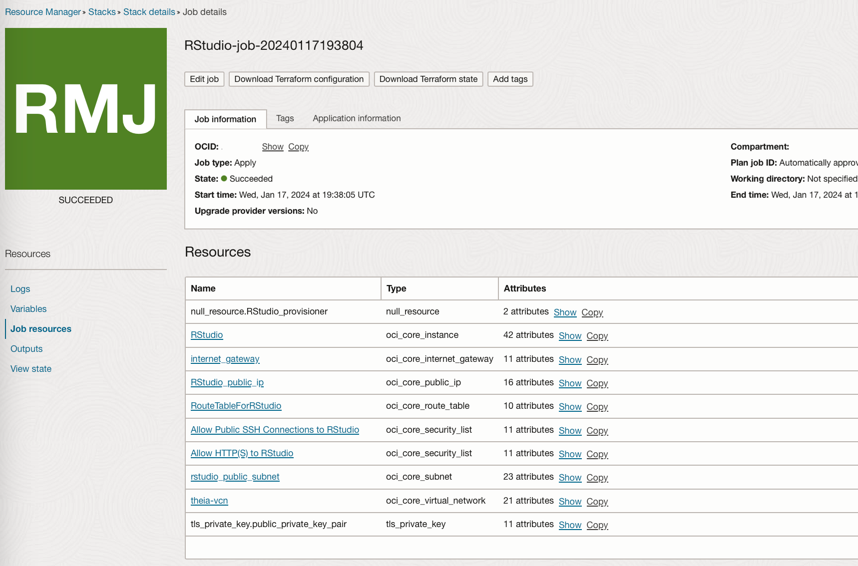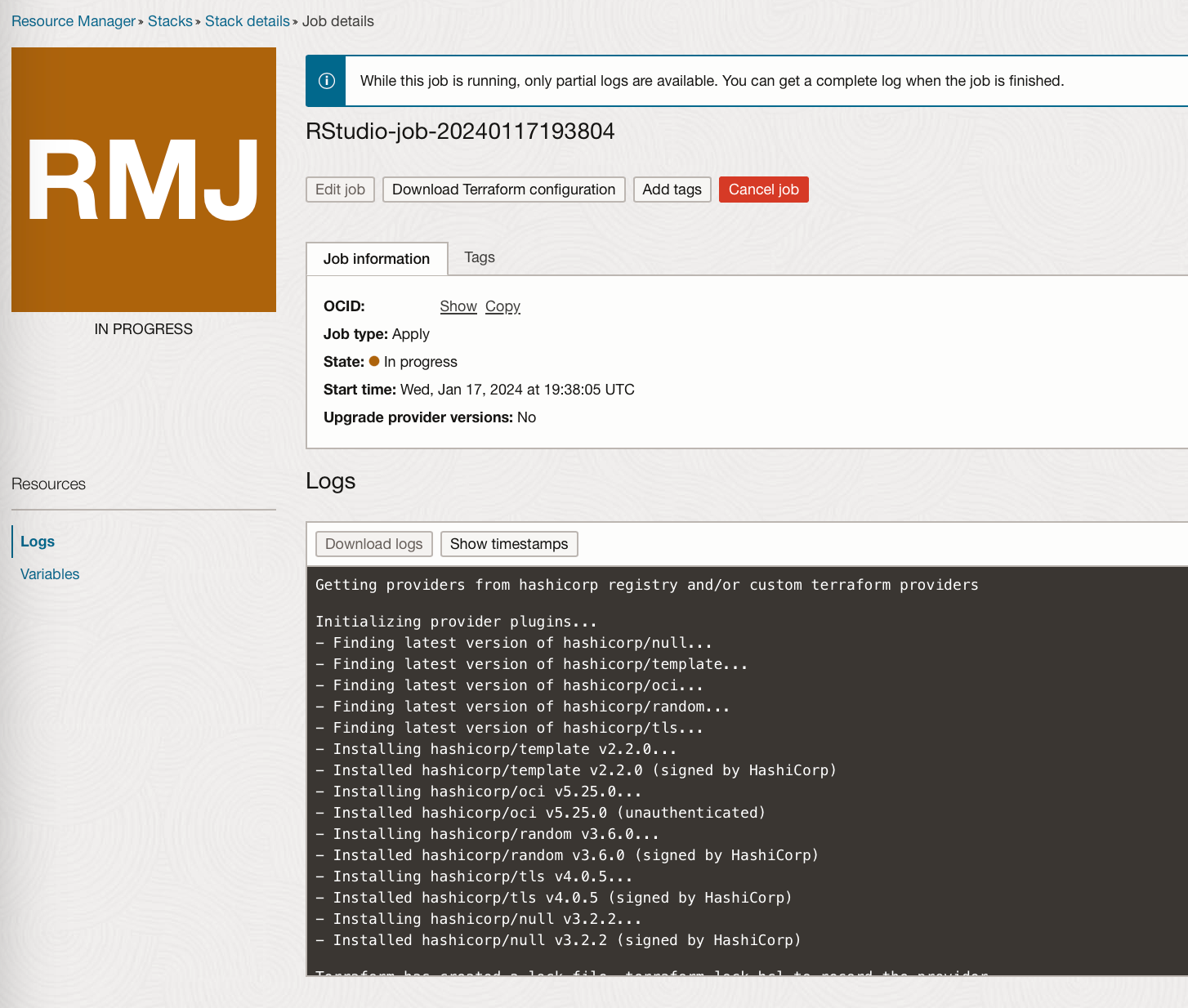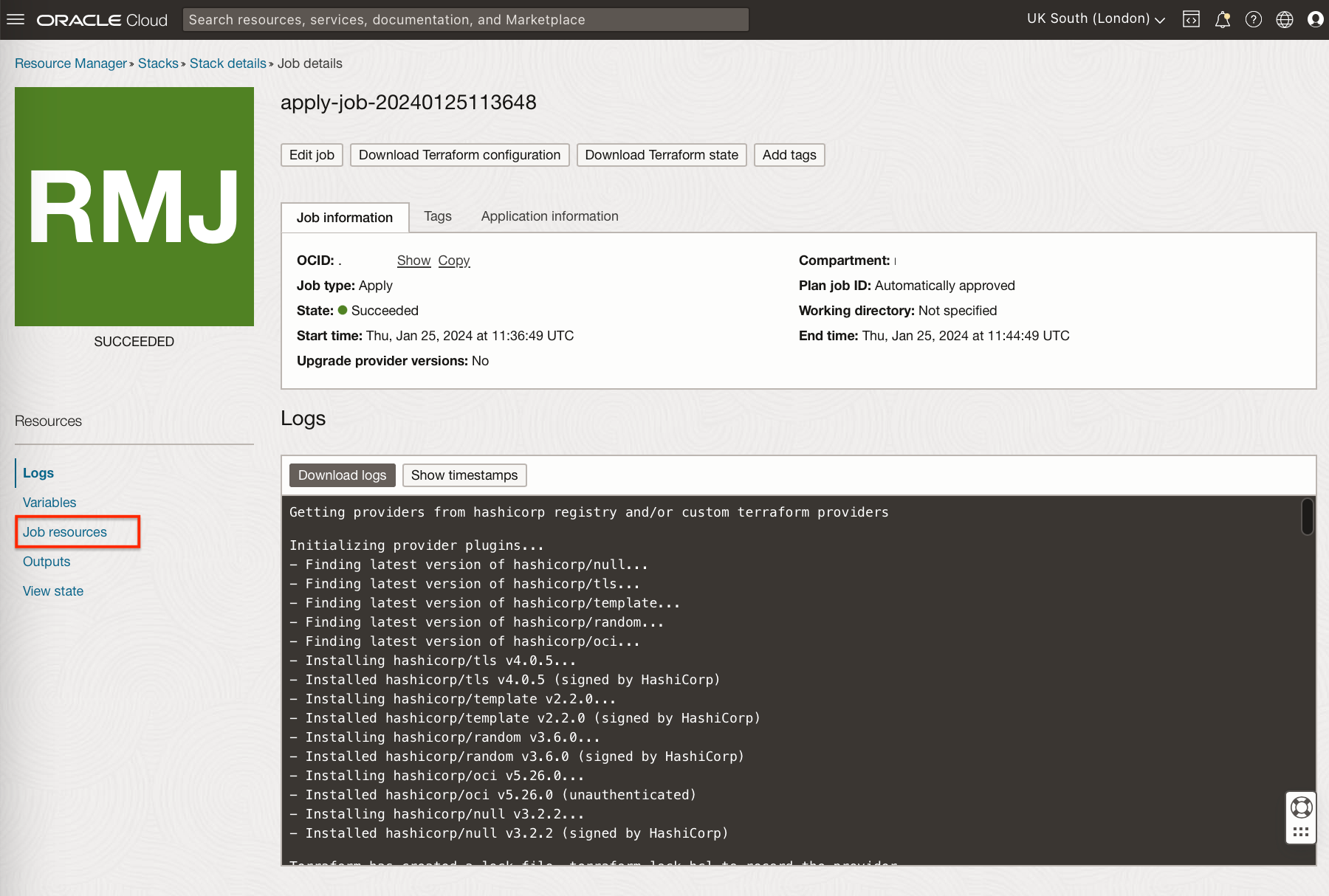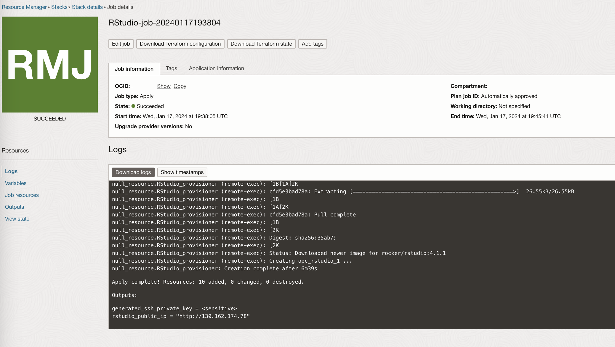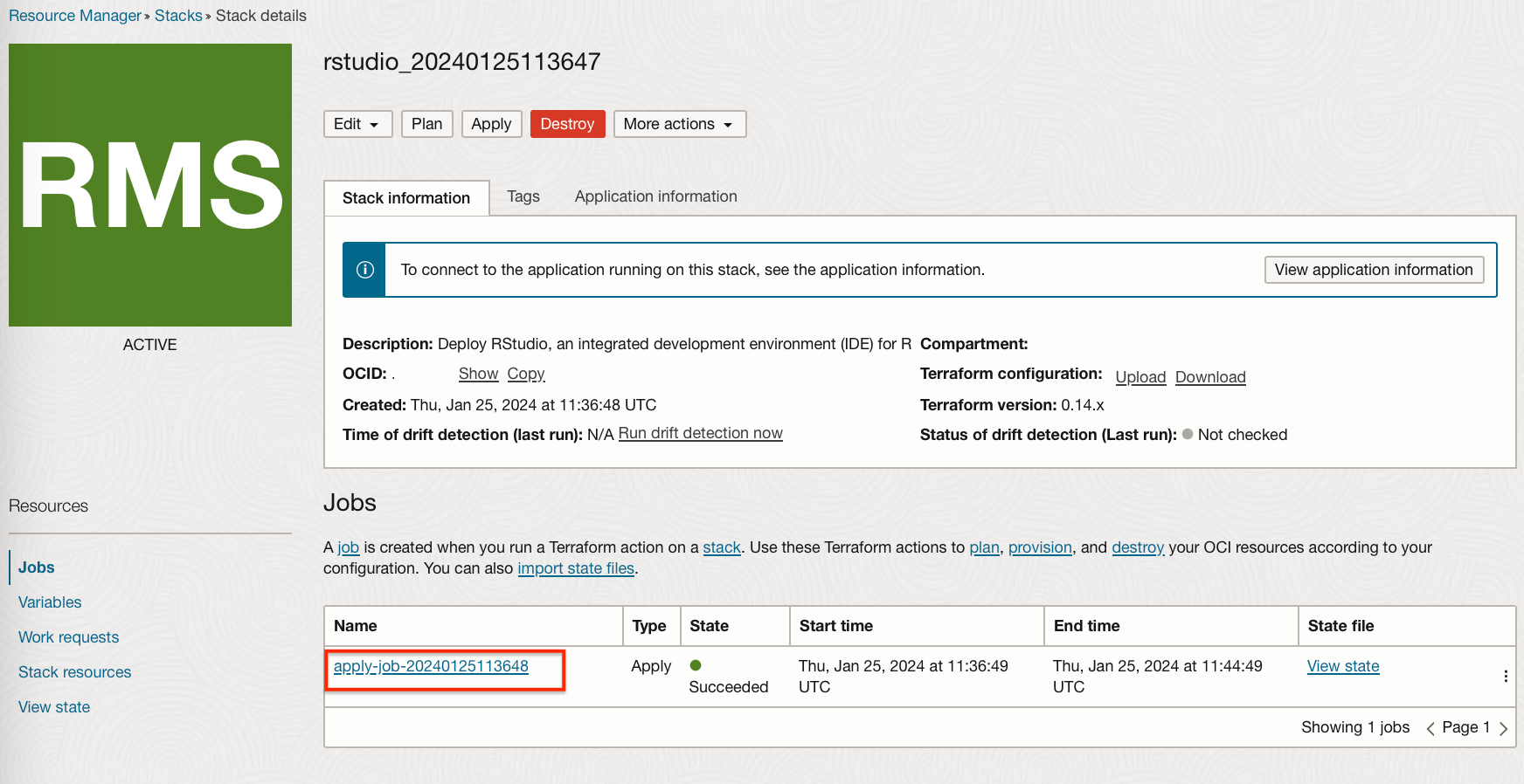 Using either method above creates an instance via a job, so all of the instructions below will be the same (for either method). Details for the job can be found under Developer Services → Resource Manager → Stacks.