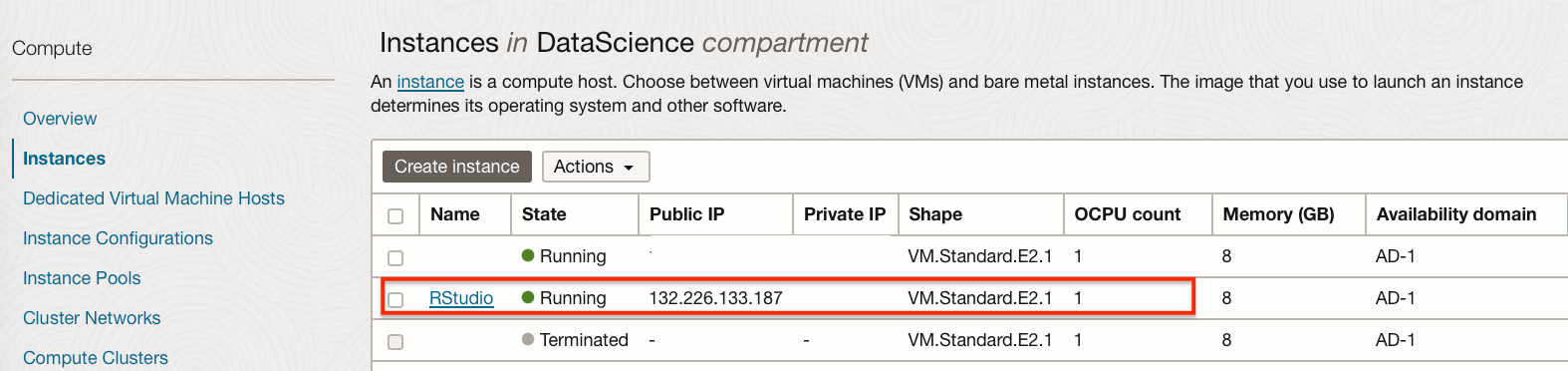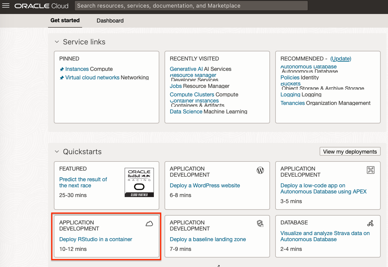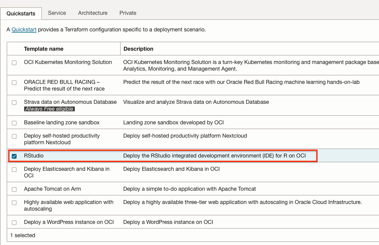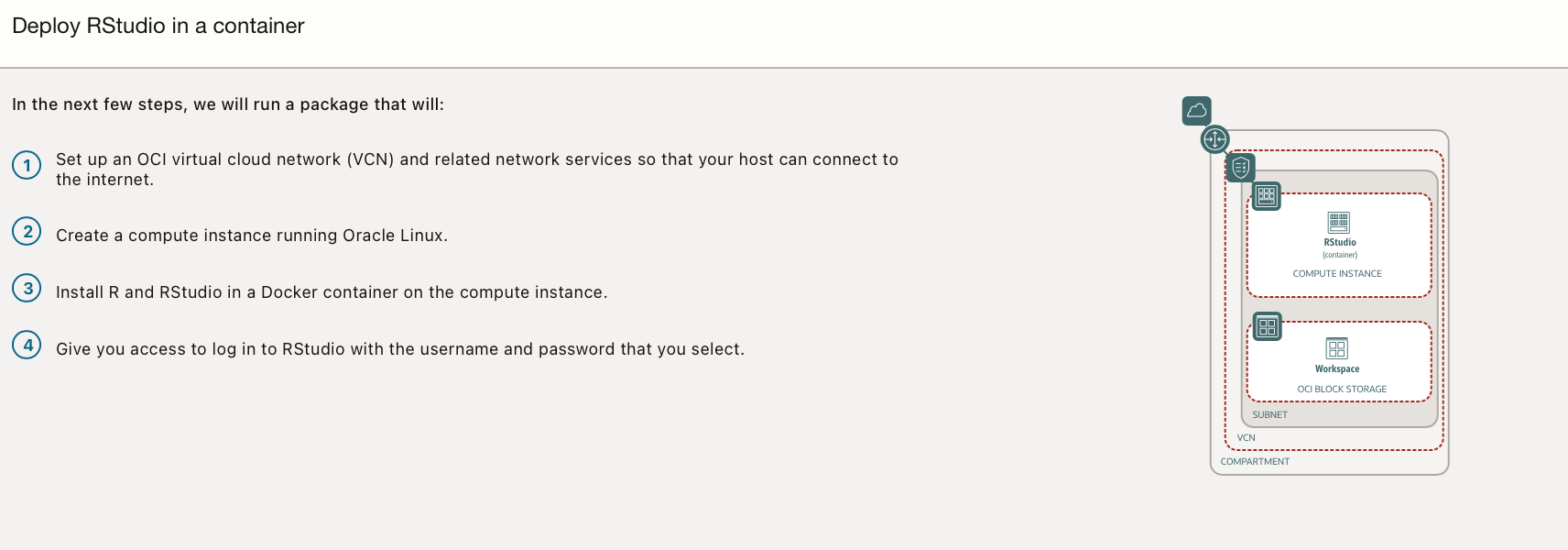 From the OCI home page, under “Quickstarts” there is an option called “Deploy RStudio in a container”
