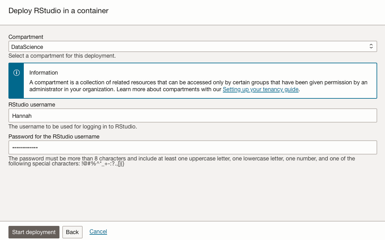 You can decide which compartment you wish this to be created in, and set a username and password for the RStudio Server Login.