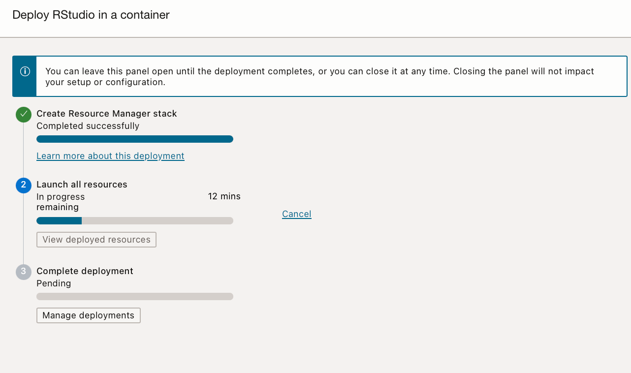 When you click “Start deployment” a resource manager stack will be created and the compute instance and docker image will be created & started, this will take a few minutes.