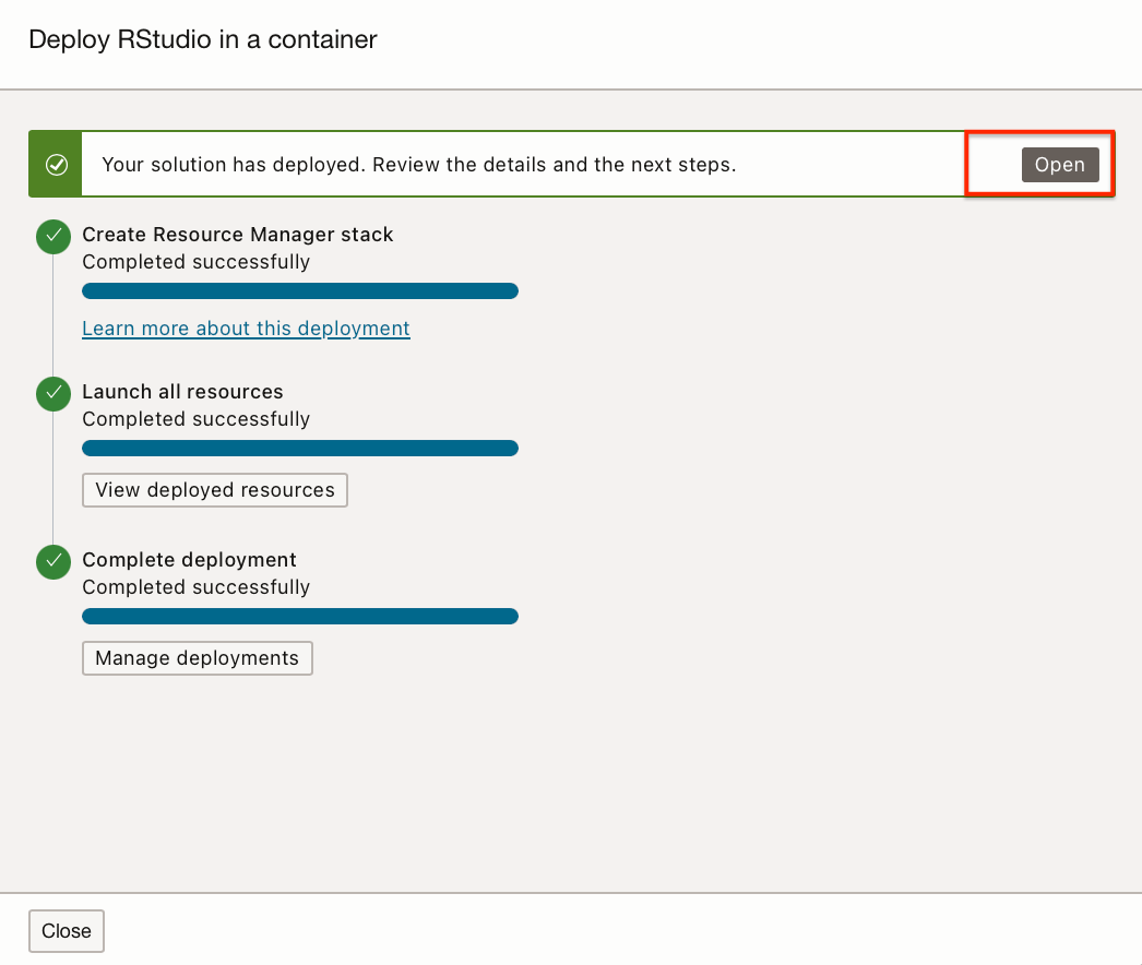 When it has completed click the “Open” button to go directly to the correct URL for RStudio Server.