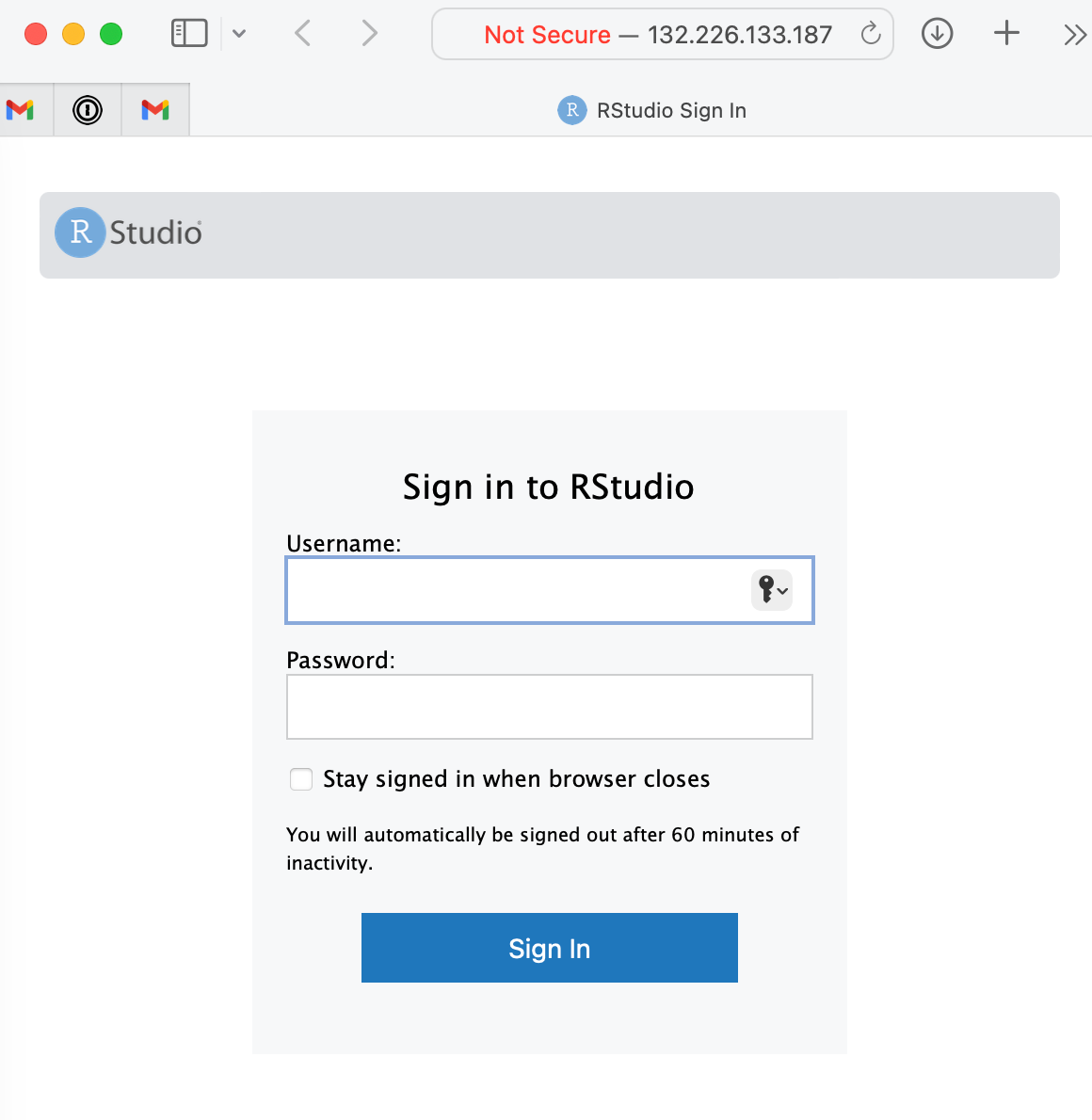You should then be able to see the IP of your RStudio instance, and if you prefix this IP with http:// in your browser it will take you to the RStudio Server login page as above.