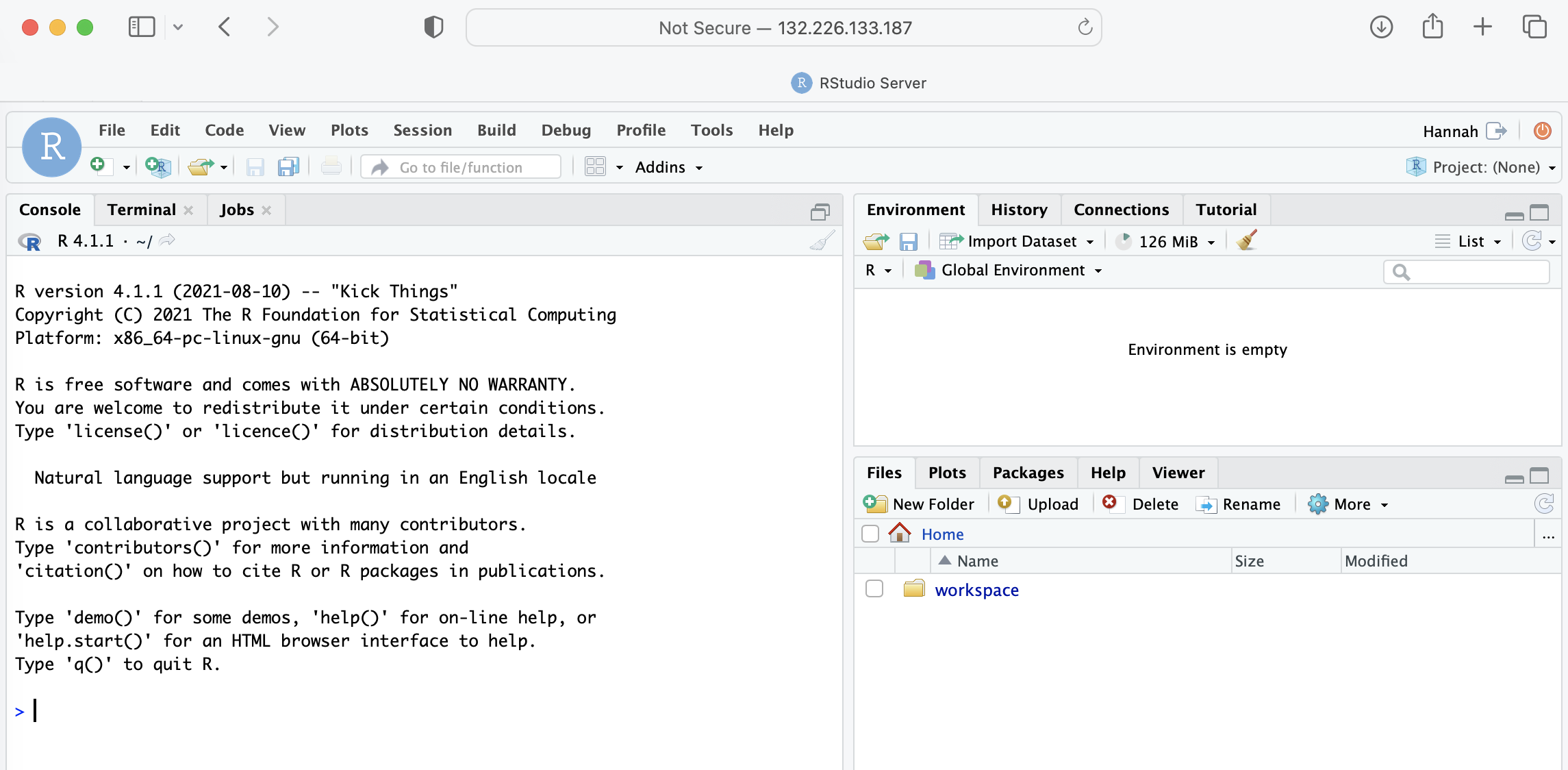 When you log into RStudio Server you will see the IDE, it has several panels dividing the screen: the console pane, the files pane, and the environment pane. You will also get a panel with Scripts in once you open or create one.