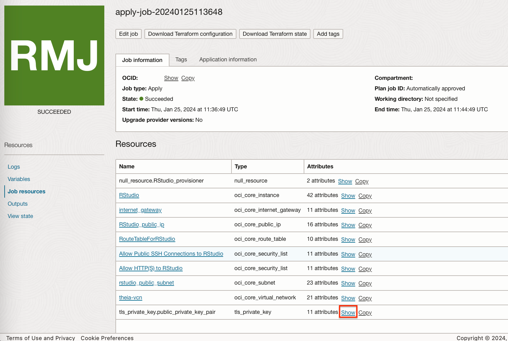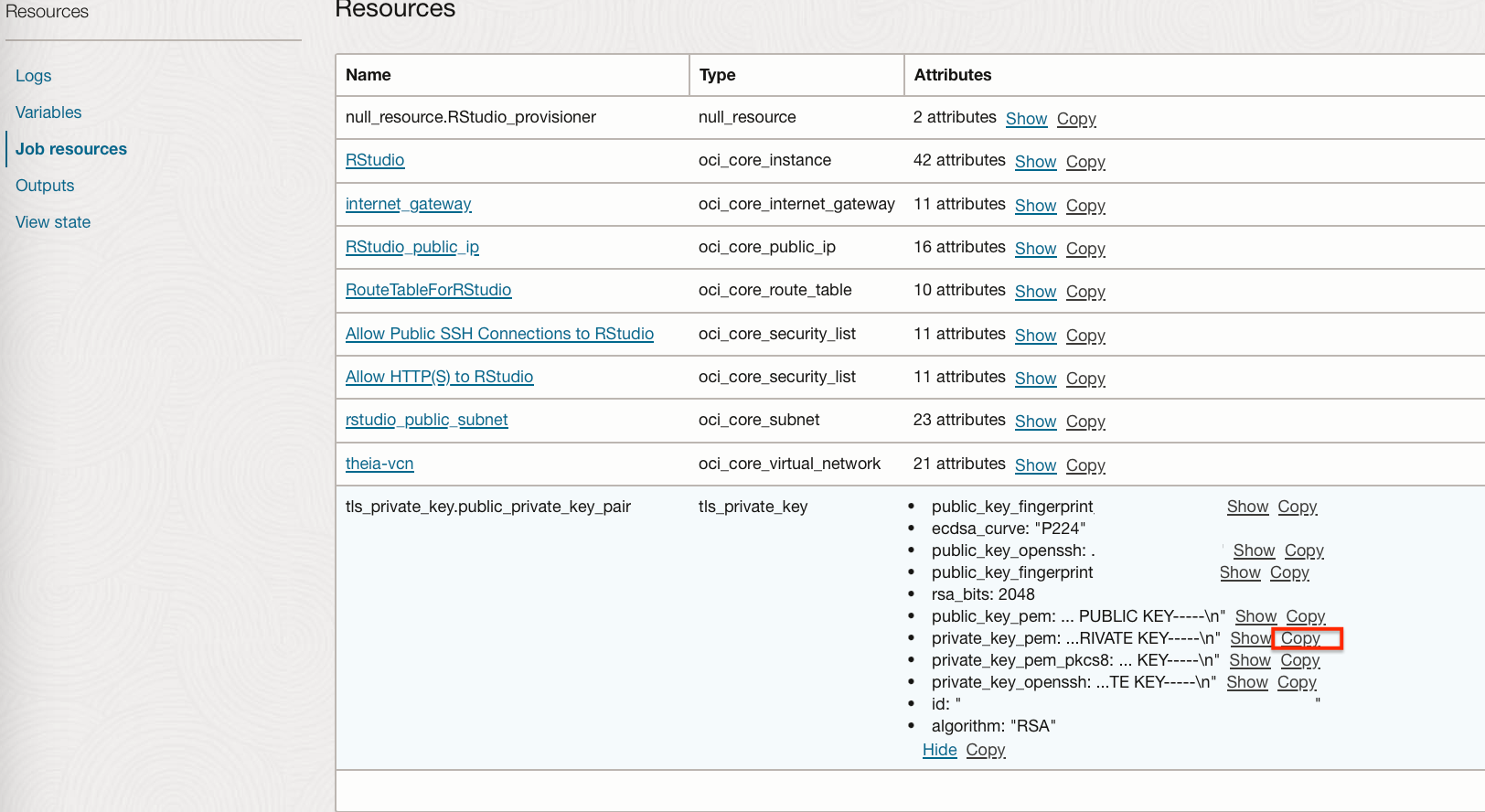 If you used the Quickstart method then the stack name will start with rstudio_, if you created the stack yourself via the second method the default name will start with RStudio-. Under the stack you will find at least one “Job” and under the job there will be a “Job Resources” tab.