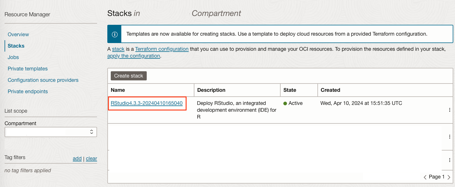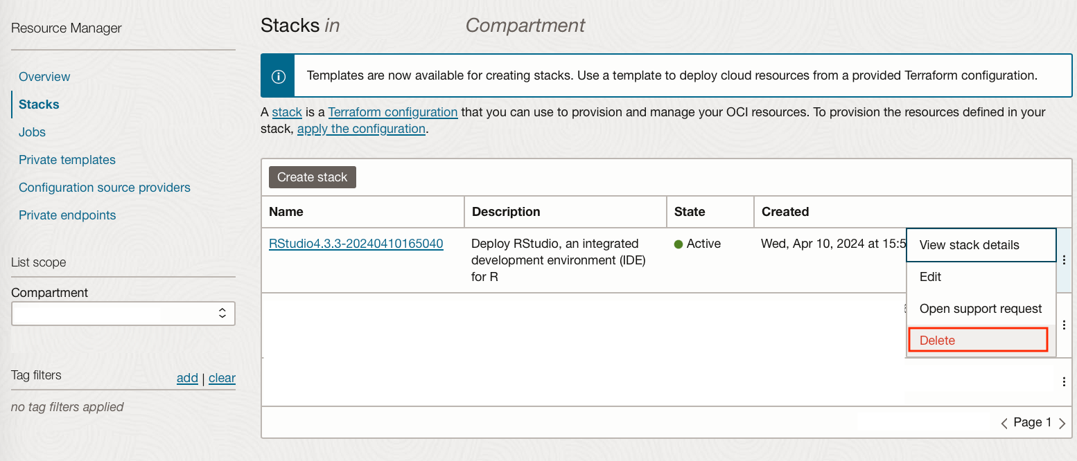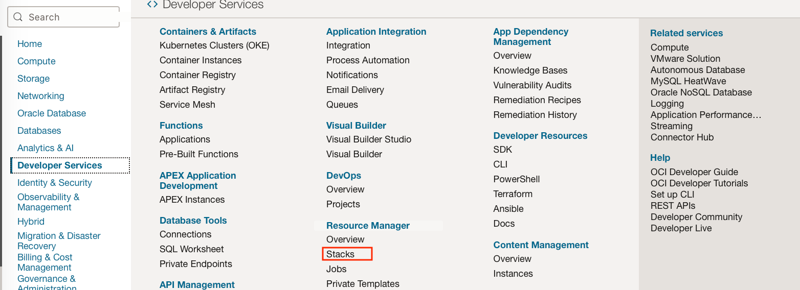 Navigate to Developer Services → Resource Manager → Stacks, change the compartment to correspond to where the stack is located.