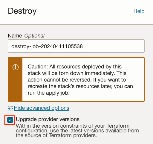 I find it useful to tick the “Upgrade provider versions” under “Advanced options” to ensure that older stacks can be destroyed without issue even if they were created using older Terraform versions.