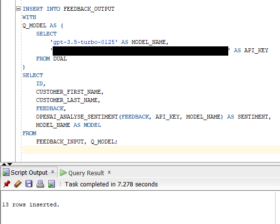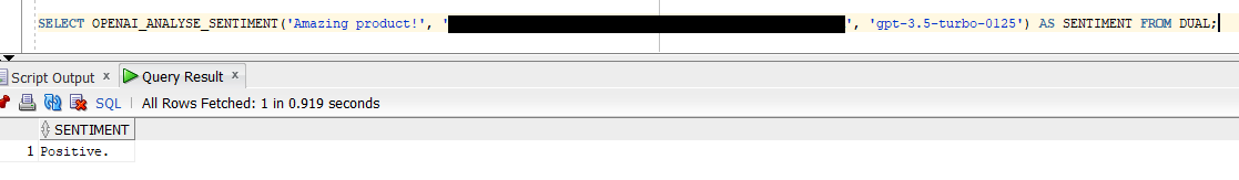 SELECT OPENAI_ANALYSE_SENTIMENT('Amazing product!', 'API_KEY', 'gpt-3.5-turbo-0125') AS SENTIMENT FROM DUAL;The result should look like this: