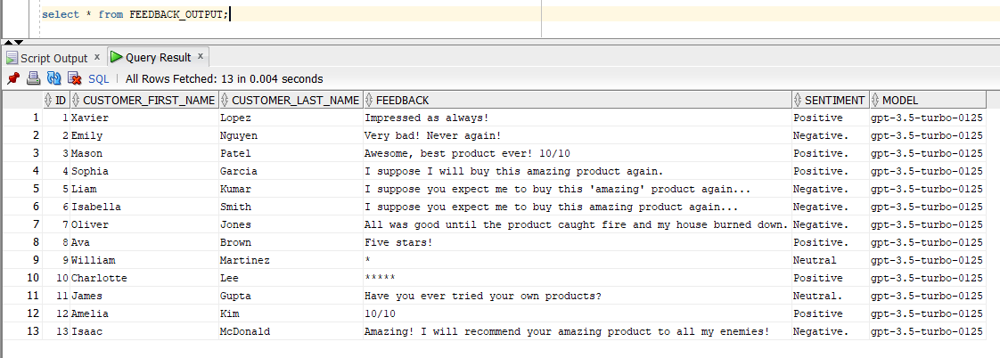 The end result in the FEEDBACK_OUTPUT table looks like this: