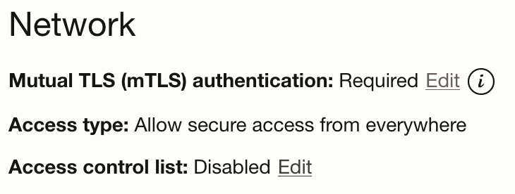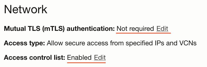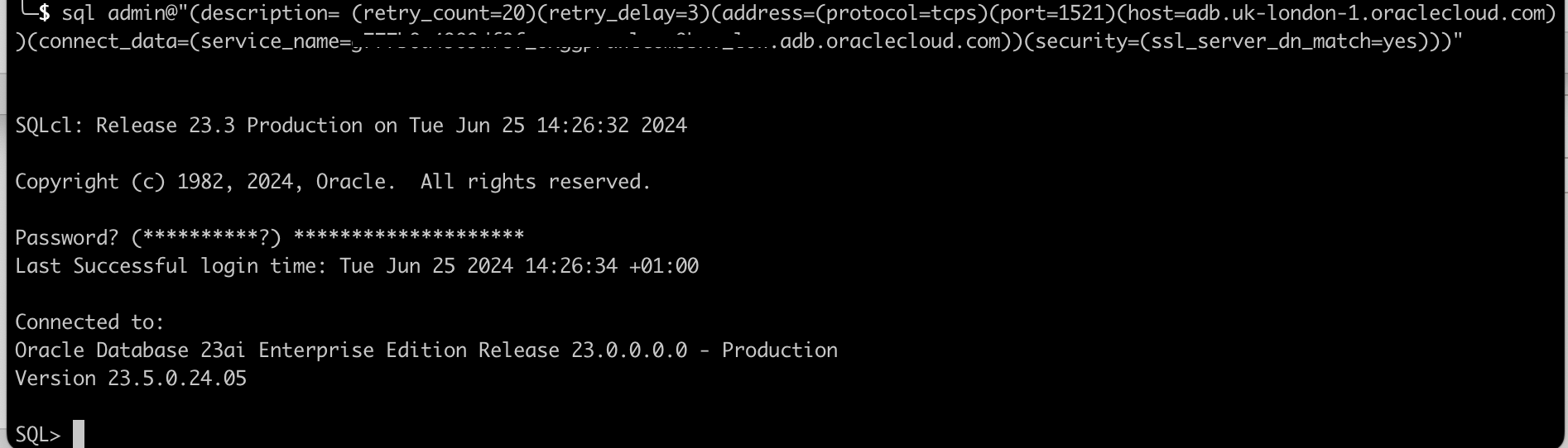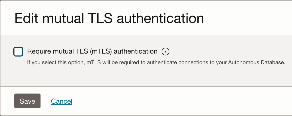To connect to such an instance using just TLS (i.e. no wallet), we can enable a Network Access control list, that whitelists your IP - there's even a convenient "Add my IP" button. Once the change has been activated, we can turn off the "Mutual TLS (mTLS) authentication". As long as you are still coming from the same IP you can now connect without supplying the wallet. (ADB listens on port 1521 for TLS and 1522 for mTLS).