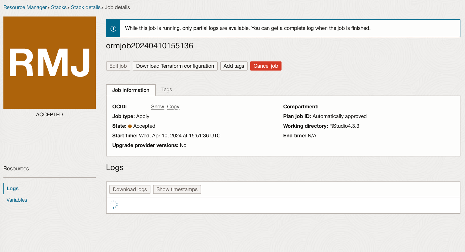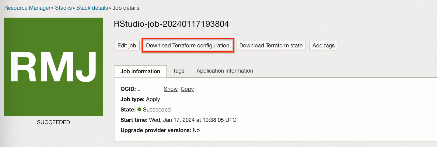 Download the R terraform template. This can be obtained from oracle or downloaded from a previously created stack job.