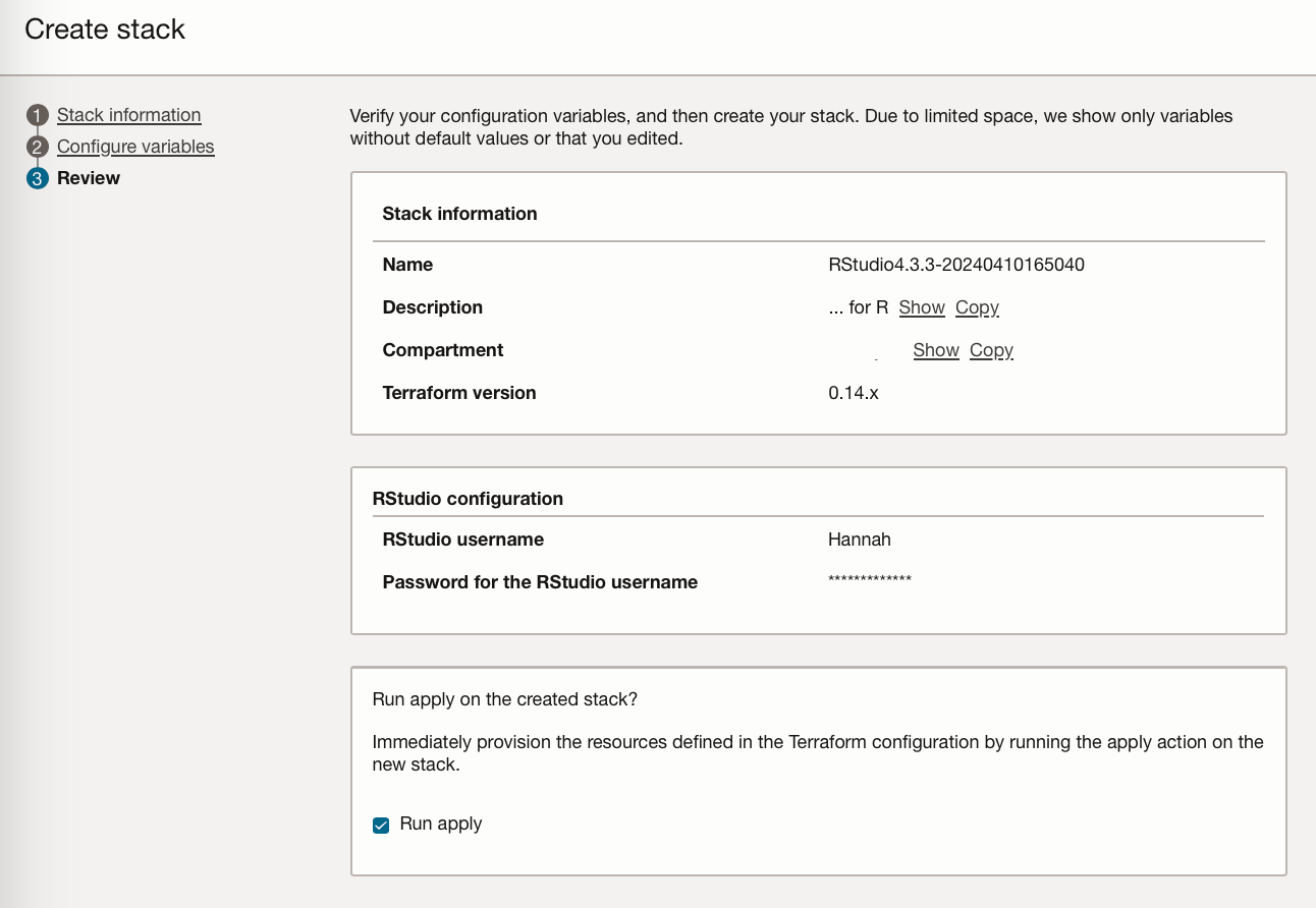 In the review stage, make sure you check “Run apply” if you would like the resources required to be provisioned immediately. Then click “Create”.