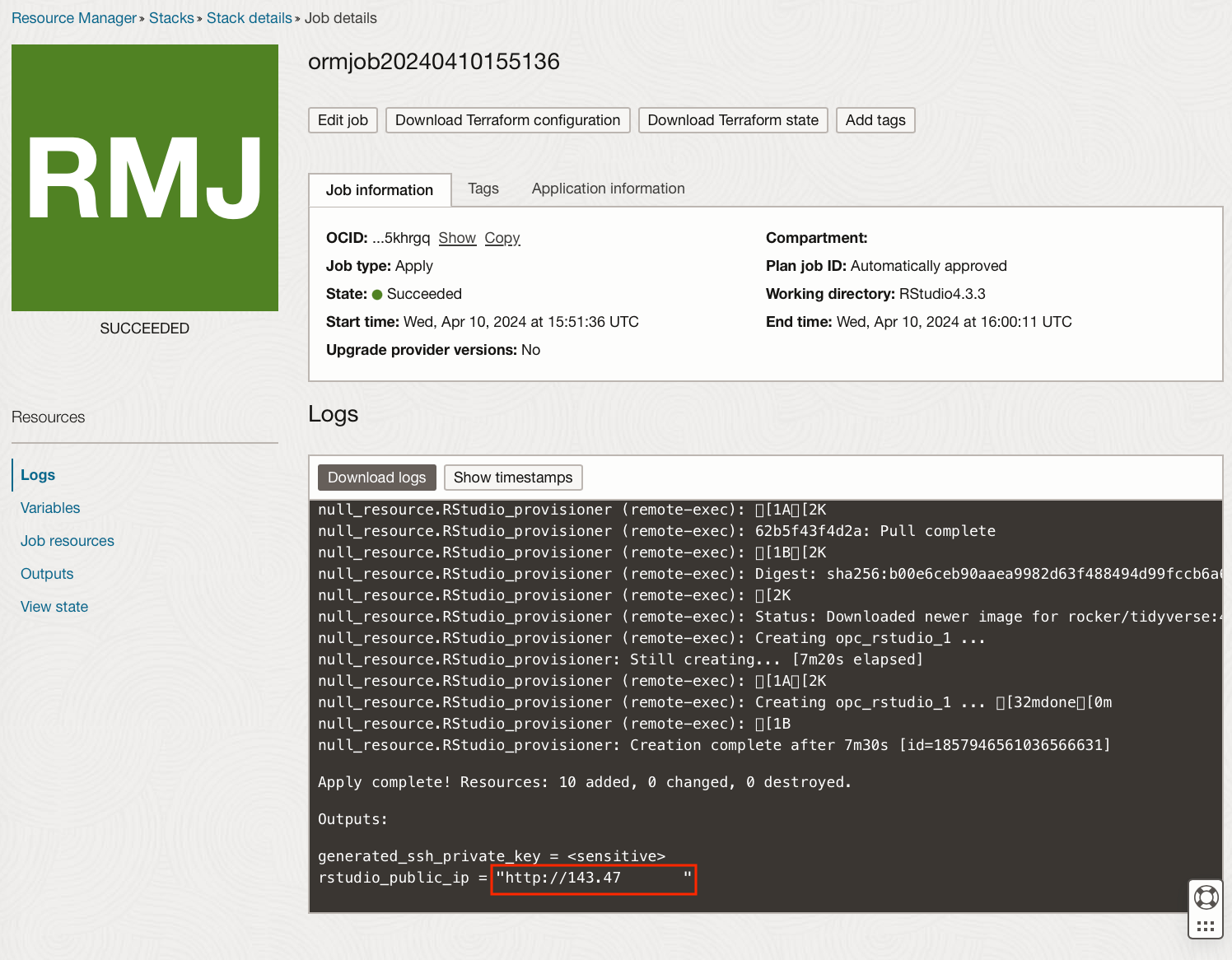 When this is completed the URL to log into RStudio Server can be seen at the bottom of the logs.