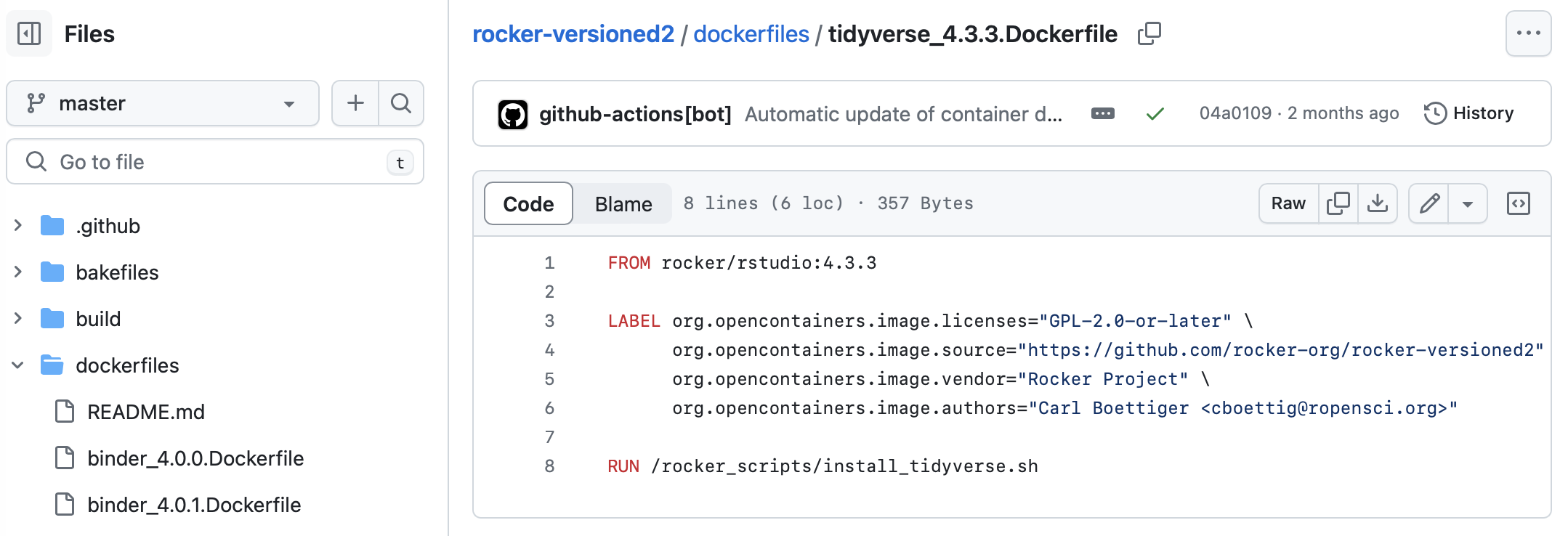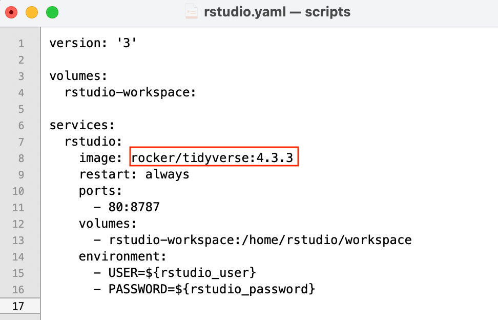 We can then edit this file to use whatever docker image we like. I have chosen to use the tidy verse:4.3.3 docker image, which gets the latest version of R and tidyverse.