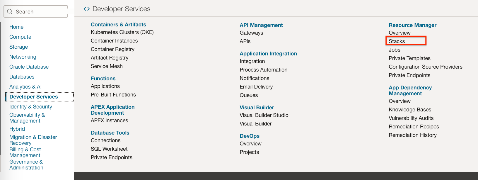 Navigate to Developer Services → Resource Manager → Stacks