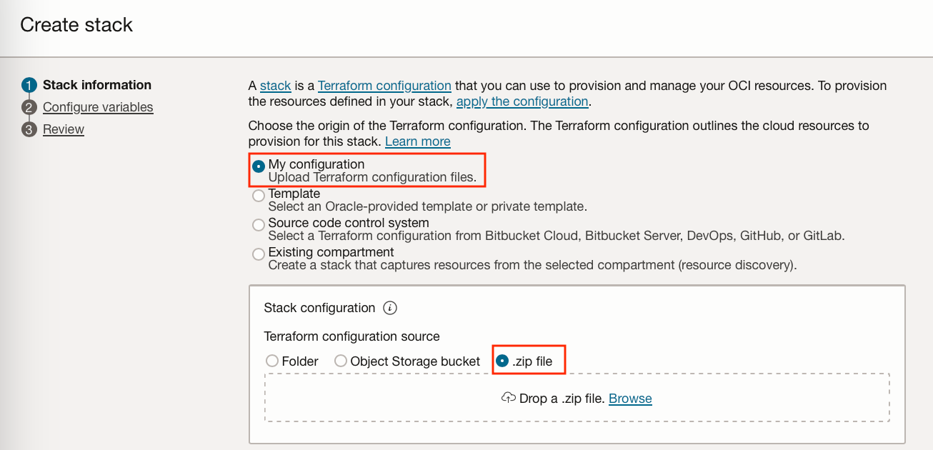 From here you can select “My configuration” and upload a zip file of the edited template terraform configuration file.
