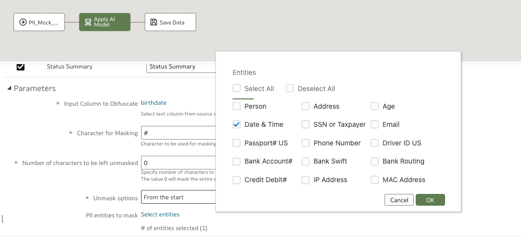 PII entities to mask - by default select all the PII data entities. You can deselect any of the entities not targeted by your requirement here.