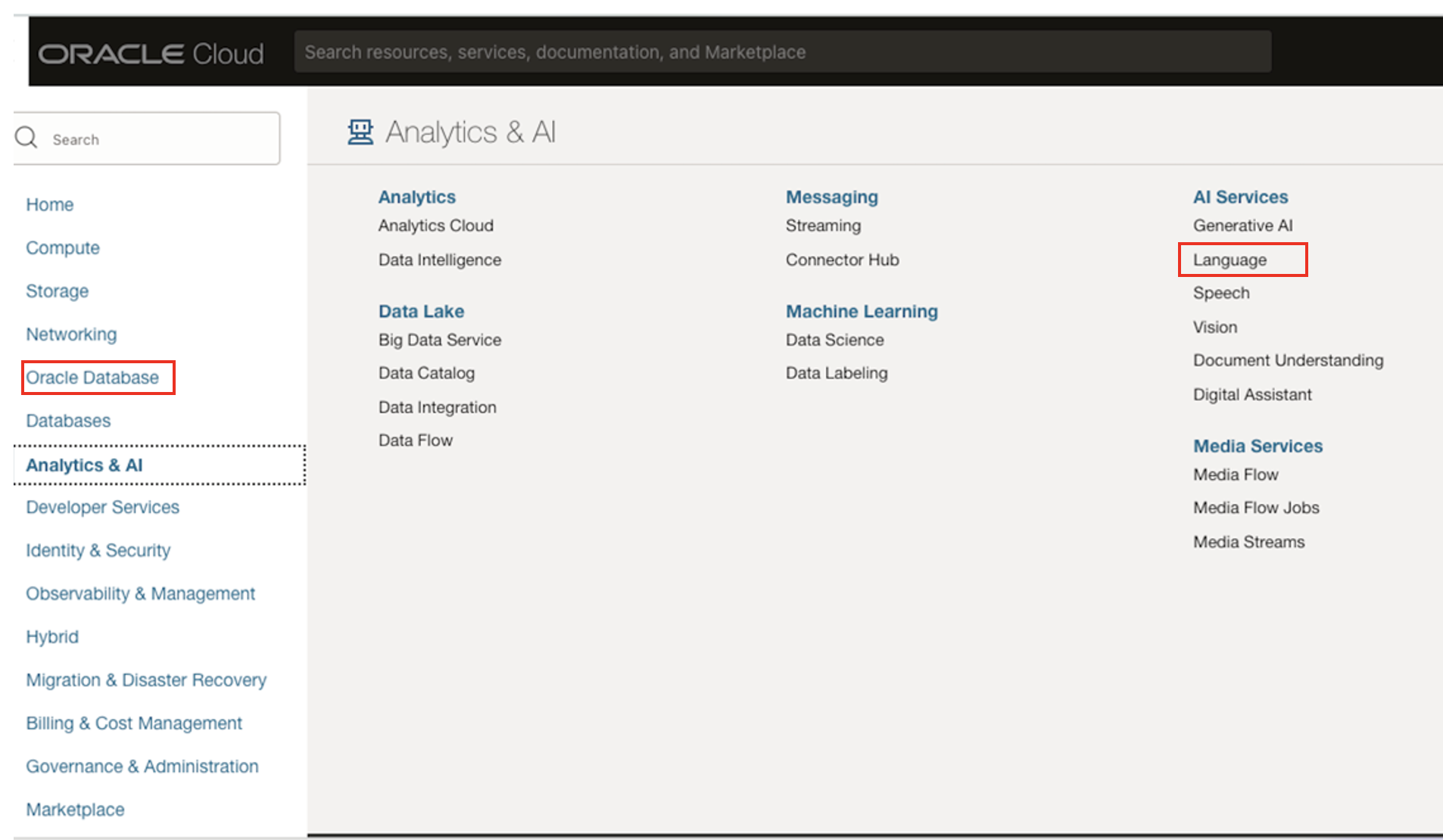 To get a feel of how the models function, head to your OCI tenancy and from the navigation panel select Analytics & AI > AI Services > Language.