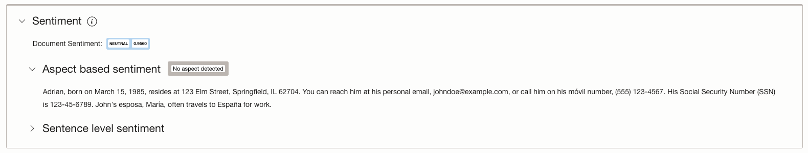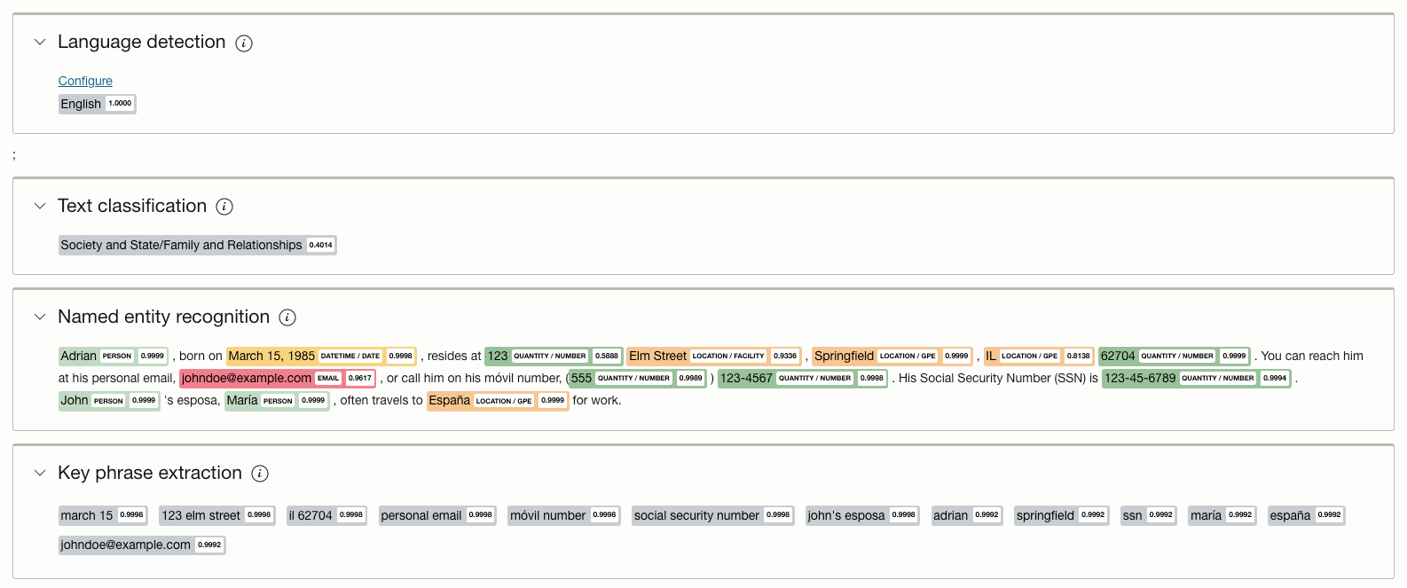 In less than a second, the results are available to you that categorise the output from each model demarcating the identified information as shown below.