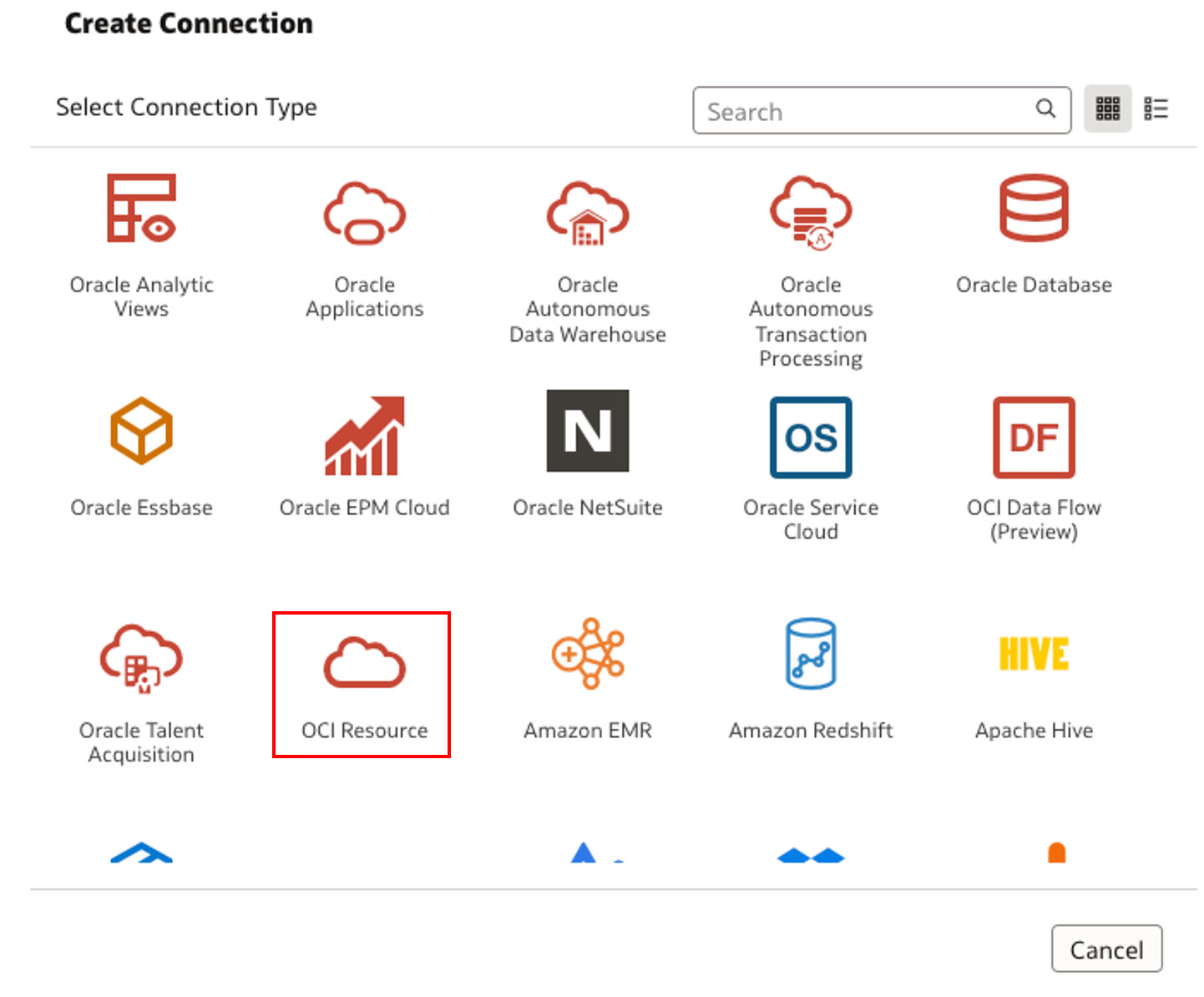 From your OAC instance, select Create > Connection > OCI Resource.