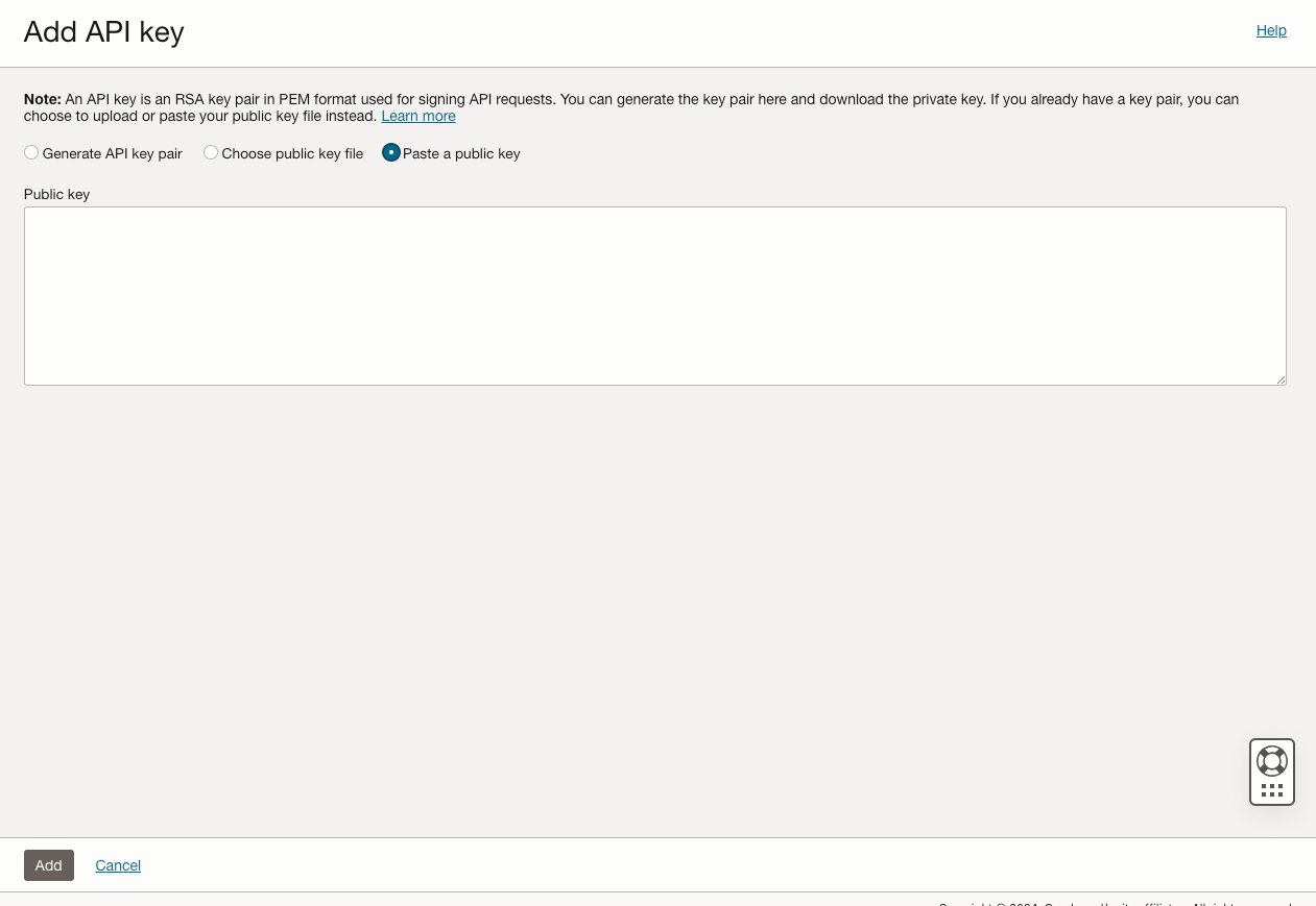 In the Add API key window, select the Paste a public key option, enter the public key generated and click on the Add button.