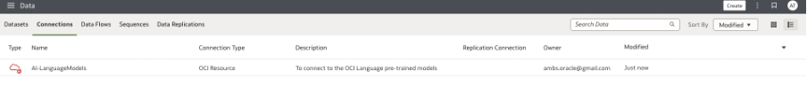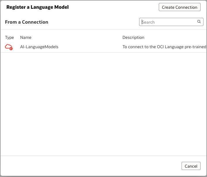To get the OCI Language pre-trained models onto Oracle Analytics, first create a data connection to the OCI tenancy where the language models are running.