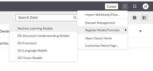 To register the pre-trained language models to OAC, click on the kebab menu option > Register Model/ Function > OCI Language Models.