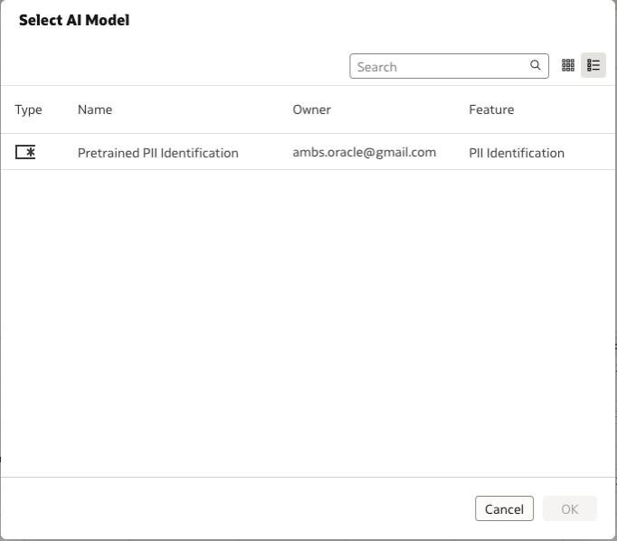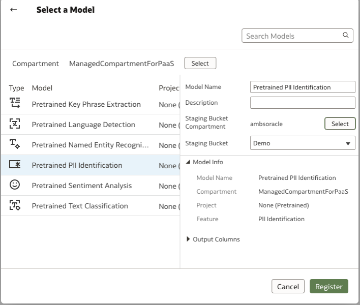 Now select the pre-trained PII Identification model that was registered previously in your Oracle Analytics Cloud environment.