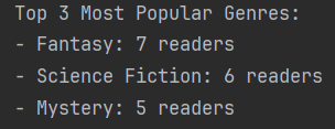 Now let us do a few searches. First, we want to query the above graph for the Top 3 most popular Book genres. (We will use the Counter collection for that: from collections import Counter.)